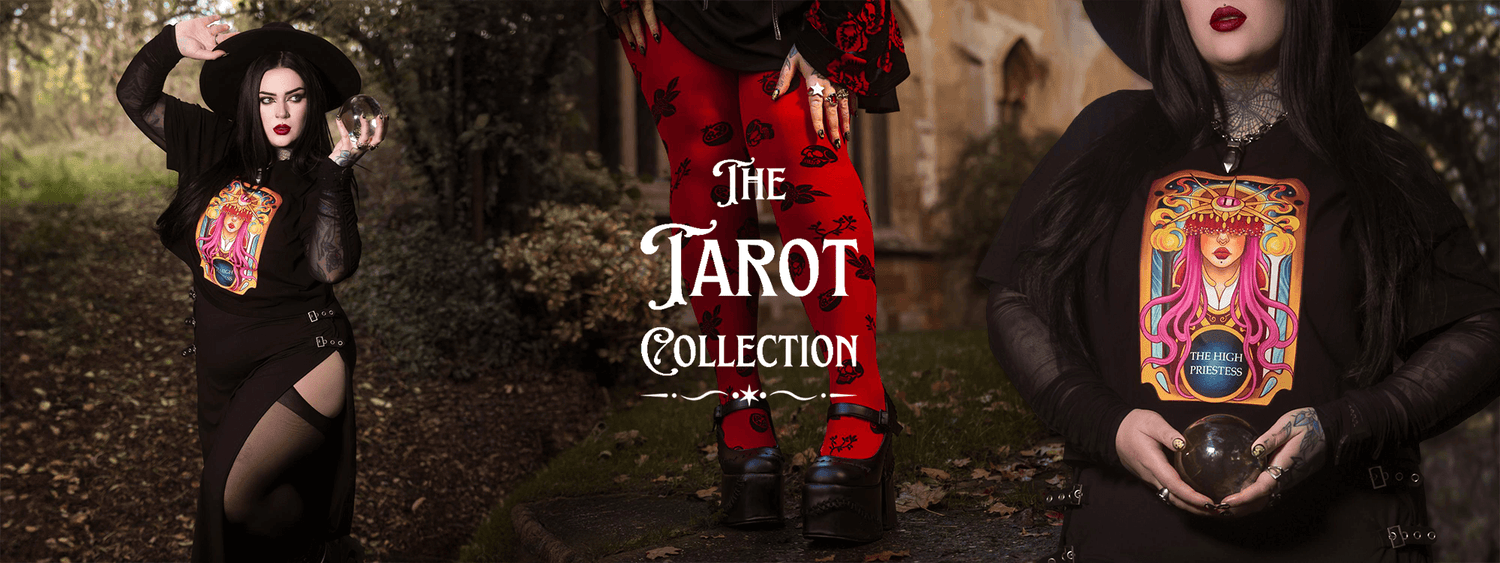 To complete your look, choose from three luxurious patterned tights: the sheer Corra Bloom Flower Back Tights, the vivid Skull Flower 80 Denier Tights, or the mystical Snake Cross Stitch Tights.