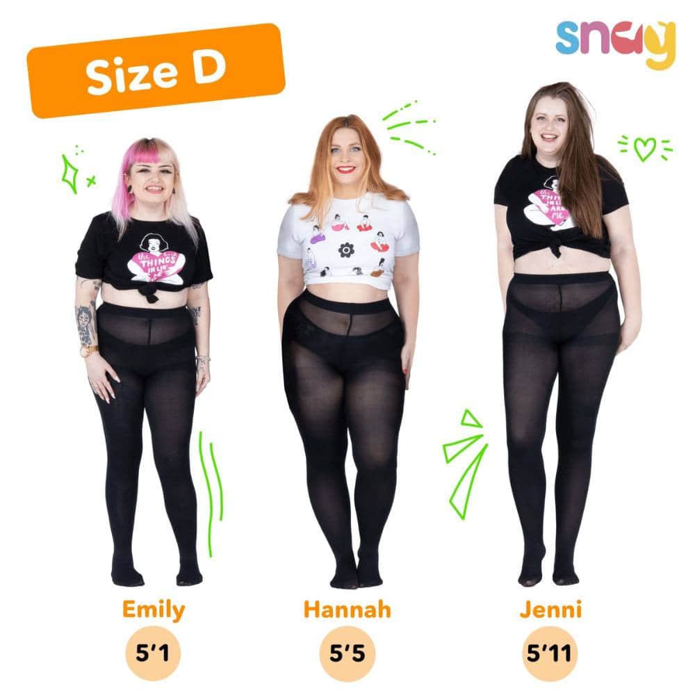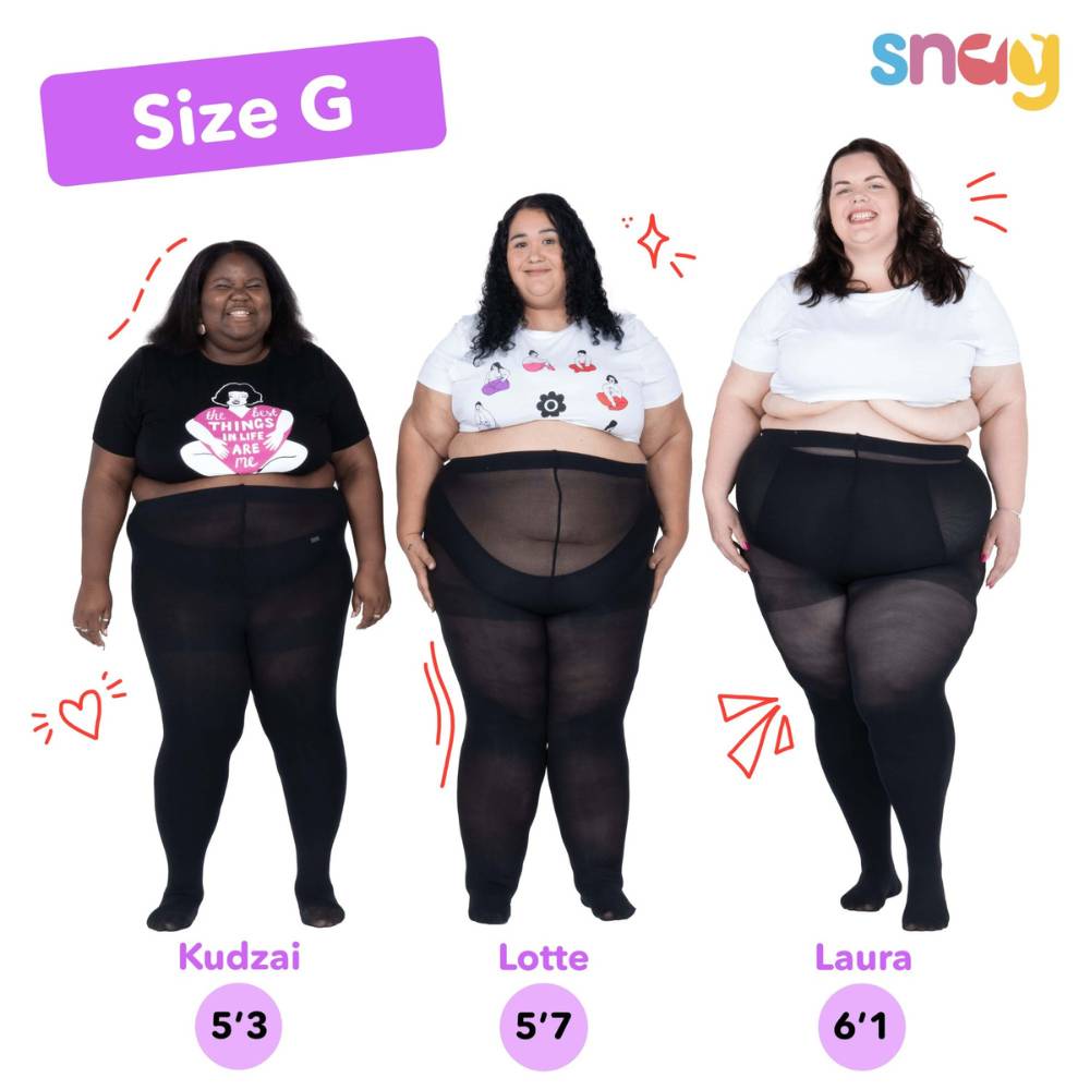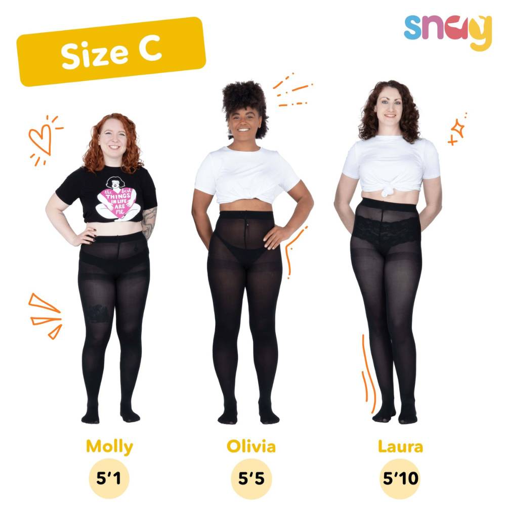 Choosing the perfect size of Snag tights is really easy. Just find your regular clothing size in the chart and trace along to find your height. Your Snag size will be a letter in the table. There are two different types depending if you have a prominent bum and tum or not. Our tights are true to size, however, if you're between sizes, size up.