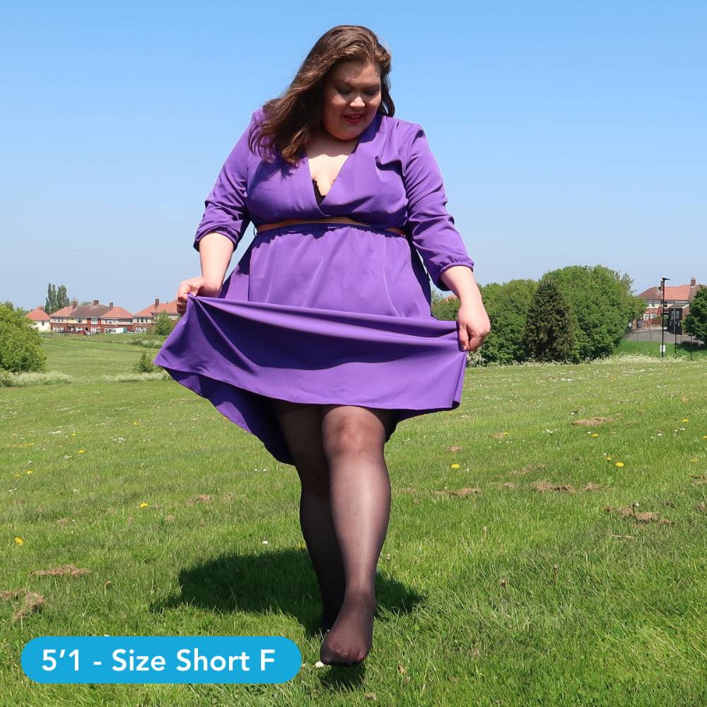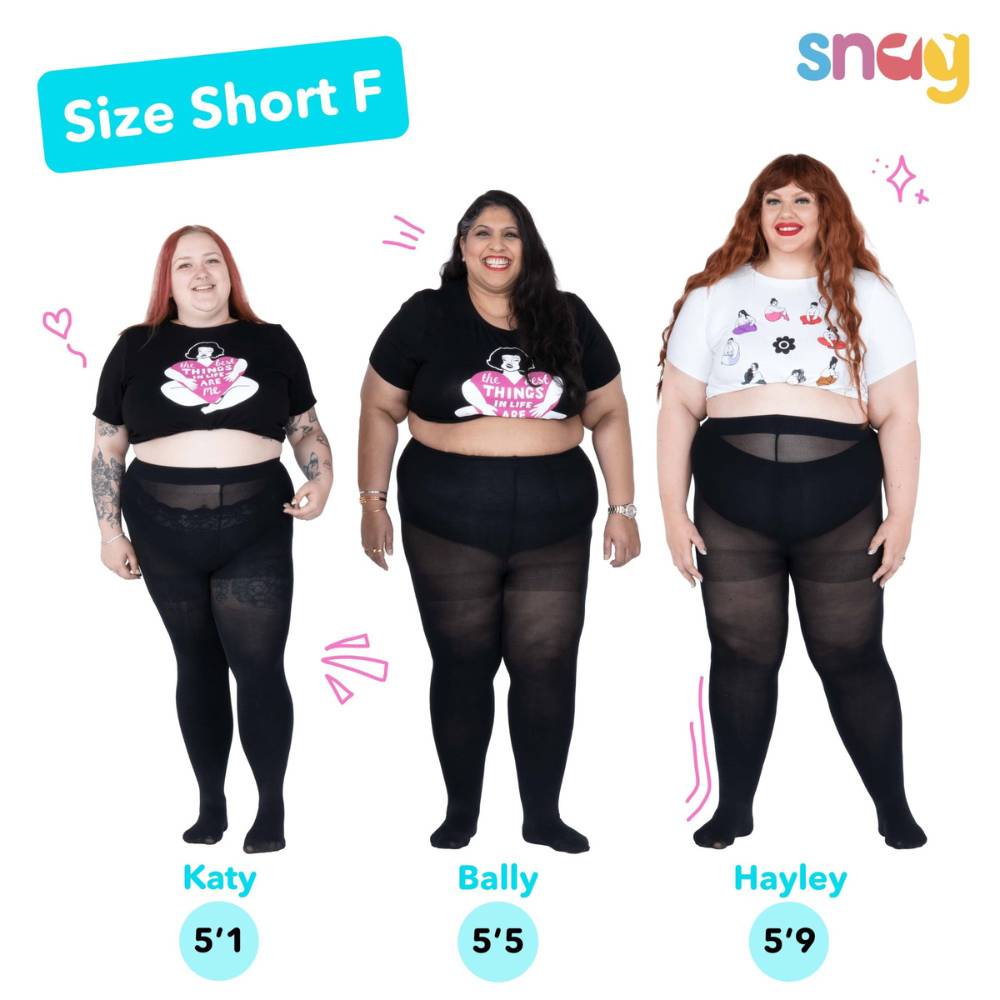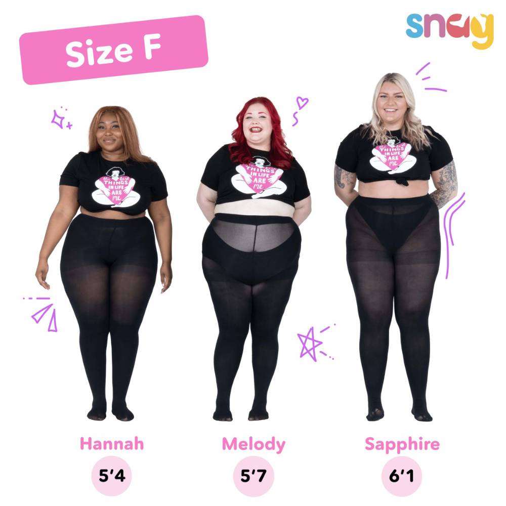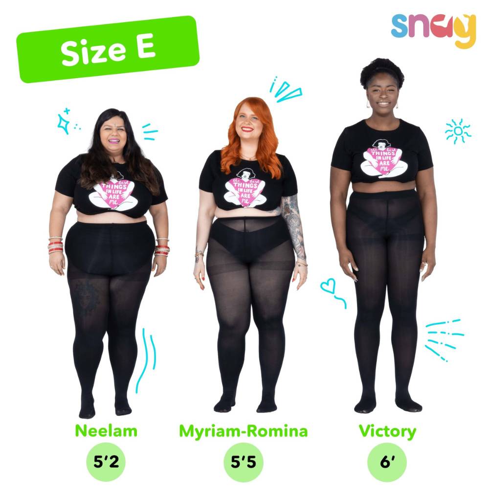 Choosing the perfect size of Snag tights is really easy. Just find your regular clothing size in the chart and trace along to find your height. Your Snag size will be a letter in the table. There are two different types depending if you have a prominent bum and tum or not. Our tights are true to size, however, if you're between sizes, size up.