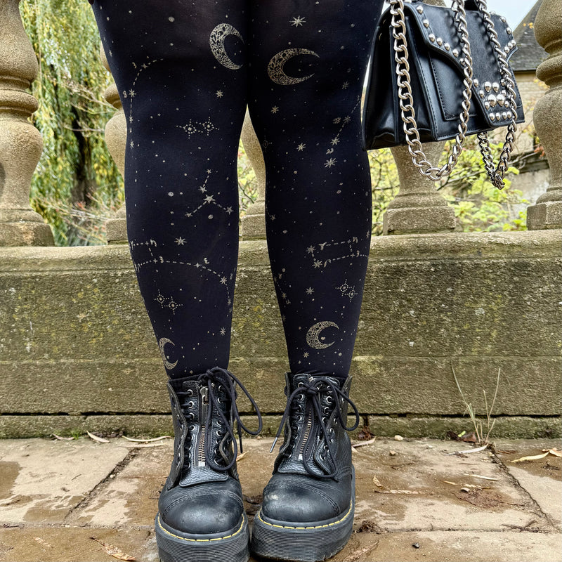 Hallow-queen are the perfect wearable witchy tights. A black 80 denier base with dreamy moon and stars design in gold glitter. Perfect all year round thanks to breathable yarn. No digging, in, no rolling down or sagging. Subtle enough to be worn for all occasions, these are a hidden gem that you need in your tights collection.