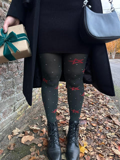 Step into the season with Woodland Magick, our enchanting 80 denier tights that feel like wandering through a dark, wintry pine forest sprinkled with Christmas magic. Set on a deep fern green base in our Snag colourway Crocodile, these tights feature bright red pentagram stars and tiny grey dinky dots scattered across the legs, all cleverly knitted into the fabric for a smooth, seamless finish. Festive, fun and beautifully unique, they bring a little woodland wonder and wicca to every outfit.