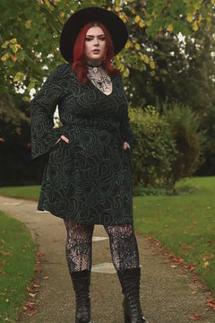 The dress is named for the ancient Celtic goddess Corra, a powerful deity associated with the serpent—a symbol of transformation and rebirth. By wearing the Corra Dress, you connect with that potent energy of change and inner strength. The fit is designed to feel just as powerful. Integrated fabric ties let you find your perfect silhouette, and a slightly longer back hem means you're perfectly covered when you move. With dramatic bell sleeves and a versatile knee-length cut, it's a compelling look that, yes, also has pockets!