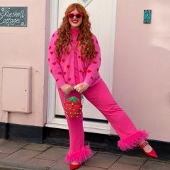 Love Me, the cardigan that wears its heart everywhere. Soft pink and scattered with bold red hearts, this joyful knit is finished with matching patterned pockets and five red buttons down the pink placket. Cut to a flattering bum-covering hip length, it's designed to feel cosy, cute and confidence boosting all at once.