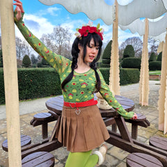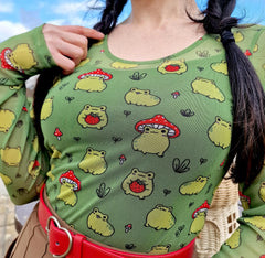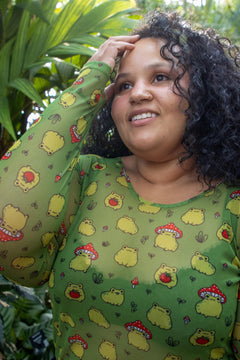 If cute frogs are your power animal, this one's for you. The Hoppy Meadow Mesh Top is set on a soft mesh base with playful green frogs dotted all over, from strawberry hugging cuties to frogs in tiny toadstool hats. This long sleeved top is bold, fun and completely impossible not to smile at. Long-sleeved with thumbholes, round neckline and a sleek fitted shape, it’s a statement that still feels easy to wear.