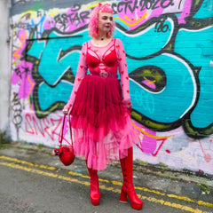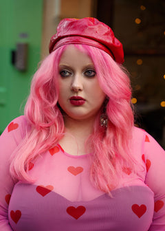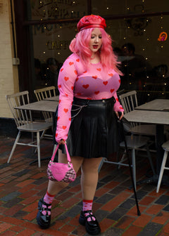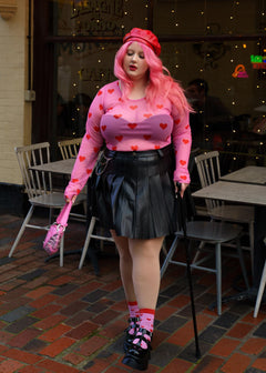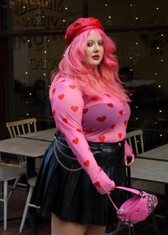The Love Me Mesh Top wears its heart out loud. Set on a soft pink mesh base and scattered with bold red hearts, this long-sleeved top is playful, flirty and just a little bit daring. Classic round neckline, fitted silhouette, designed to turn everyday outfits into something far more fun.