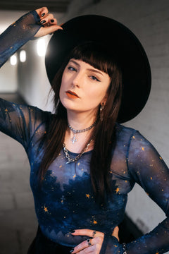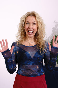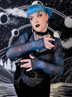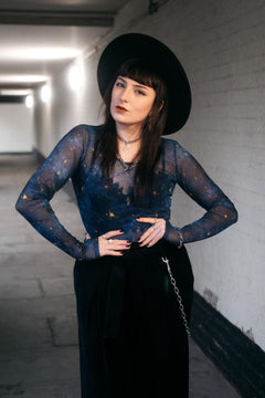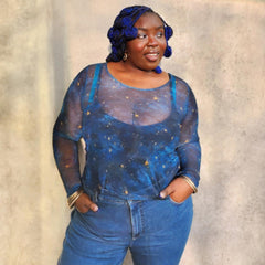 Here is the dreamy, brand-new gem of our Stars & Clouds collection, set to become your most magical wardrobe wonder. It is a semi-sheer top featuring our exclusive Nebula Stars print with swirling smudges of deep blue and teal scattered with twinkling golden stars.