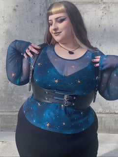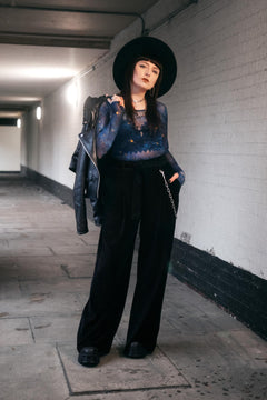 The scoop neck and long sleeves keep you covered while teasing just a hint of your curves or whatever cheeky layer lies beneath. Slip it on once and you are instantly transported to a galaxy of style that feels like wearing the night sky on a clear winter evening. Team it with a black tank underneath for everyday modesty , or vamp it up with your favourite bra or lingerie for a bolder vibe. From day to night, pair it with your go-to skirt and heels for club-ready sparkle, or throw it over jeans and boots to bring a touch of the cosmos into your daily adventures.