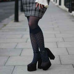 - The 'Sock': The lower leg section features a playful, opaque navy base with crisp white polka dots—a clean and vibrant nod to whimsical Korean trends.