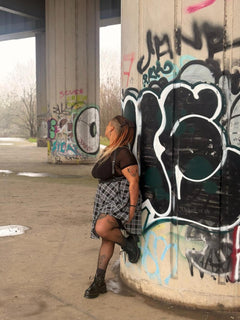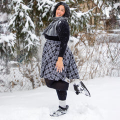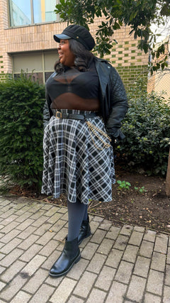 It is smooth, cosy and flows with your movement instead of clinging, giving you that perfect twirl moment whether you are heading out for the day or just spinning because it feels good. The Cairn colourway features a deep black base with clean white and grey stripe tartan plaid for sharp, minimal vibes.