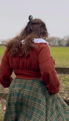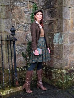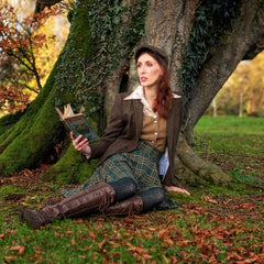 The Glenfern colourway features a deep forest green base woven with brown and light green tartan plaid, inspired by mossy paths, ancient trees and crisp woodland air. Style it with chunky boots and knits for rustic vibes, layer it with tights and cardigans for full cottagecore romance, or contrast it with black for a darker, more mystical dark academia edge.
